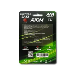 ถ่านชาร์จพลังงานสูง Atom รุ่น AT3 ขนาด AAA ความจุ 750mWh แรงดันคงที่ 1.5V มาพร้อมพอร์ต USB-C ในตัว ไม่ต้องใช้แท่นชาร์จ แค่เสียบสายก็ชาร์จได้ทันที สะดวก รวดเร็ว และประหยัด